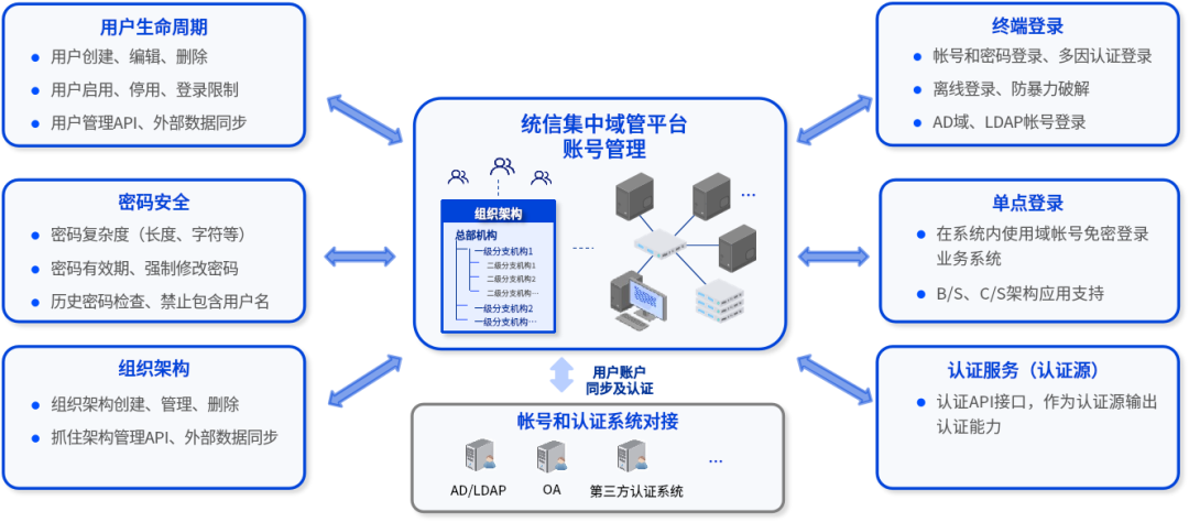 统信集中域管平台精准戳中密码重置效率低、弱密码屡禁不止、非授权终端登录难防等运维痛点,用密码自助重置、统一密码管控配置、终端 - 人员精准绑定、多因认证等的管理利器,让运维彻底告别“被动救火”的窘境。不仅帮企业大幅降低运维人力成本、提升员工办公效率,更能稳稳满足等保 2.0 等各类合规审计要求,为企业数字化转型筑牢坚不可摧的账号安全底座。