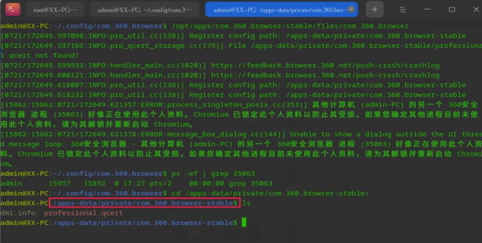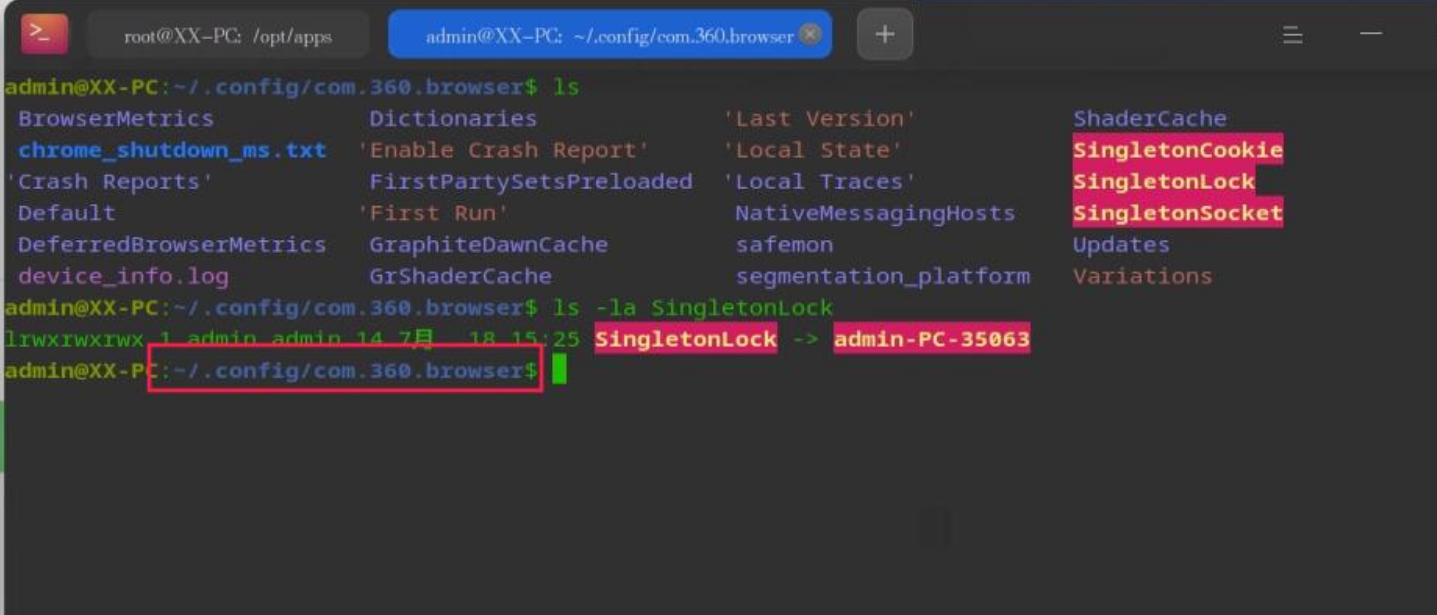 在家目录下的配置目录中(~/.config/com.360.browser),搜索“lock”相关,找到“SingletonLock”文件,查看是一个链接文件。