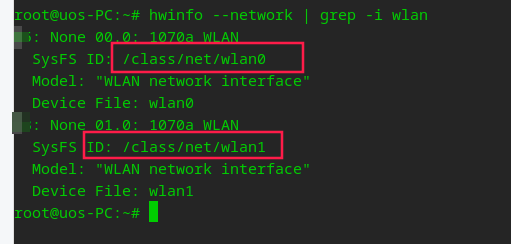 hwinfo --network | grep -i wlan找到设备路径。(展示举例使用2块无线网卡进行的模拟,实际操作时请根据用户场景实际设备名称进行替换)