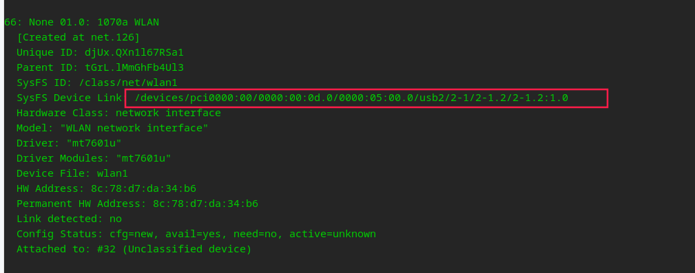 hwinfo --network找到要禁用设备的路径“SYSFS Device Link”,这里举例选择禁用“wlan1”。