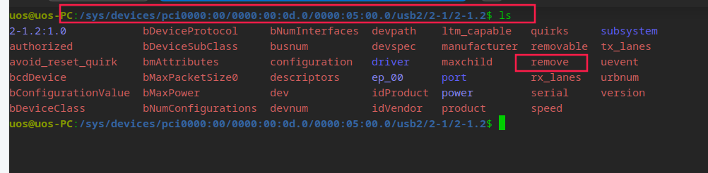 3、进入这个设备目录中,需要加上级目录路径“/sys”,完整路径即:/sys/devices/pci0000:00/0000:00:0d.0/0000:05:00.0/usb2/2-1/2-1.2/remove 目录中找到“remove”文件:
