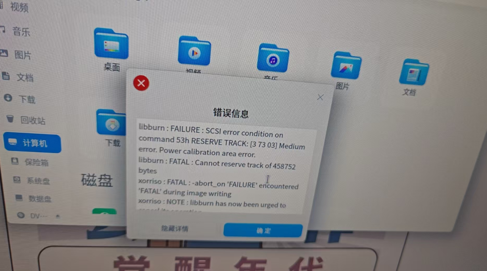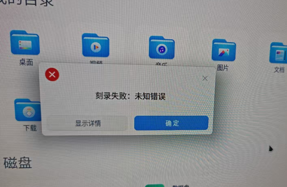 用户端使用光驱刻录光盘时,出现刻录失败,未知错误的报错提示,如下图所示: