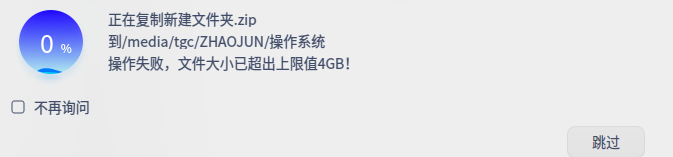 用户复制/拷备文件提示超出上限值4G,磁盘空间不足