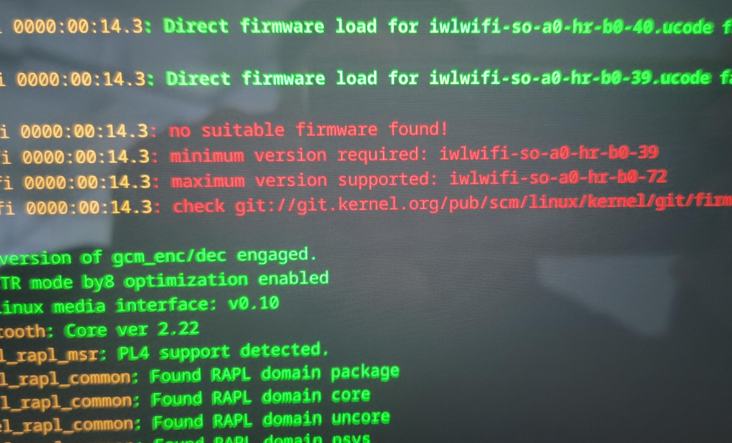 根据dmesg信息确认,需要安装iwlwifi-so-a0-hr-b0-72驱动文件(实际情况根据dmesg信息来确认),根据dmesg信息中提供的链接:https://git.kernel.org/pub/scm/linux/kernel/git/firmware/linux-firmware.git/tree/