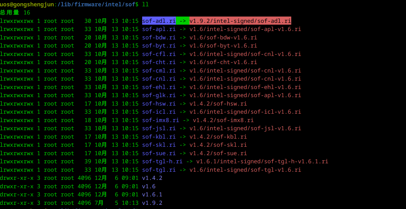 (根据实际情况来操作)如果/lib/firmware/intel/sof目录下没有sof-adl.ri文件,可以将附件中sof-adl.ri文件拷贝到/lib/firmware/intel/sof目录,然后在/lib/firmware/intel/sof目录下使用root用户,执行如下命令创建一个sof-rpl.ri的软链接即可: