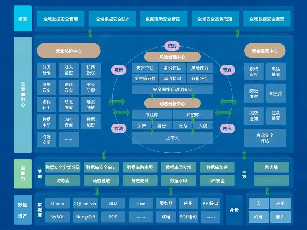 当前,我国信创政策有力地驱动了科技创新与数字化进程,进而促进经济快速发展。但在这一进程中,数据安全面临严峻挑战:一方面,现有数据安全建设局限于单点合规,各产品与组件孤立运作,未能形成体系化安全防线;另一方面,尽管存在数据安全管理中心,但由于多种异构安全设备叠加,统一管理与协同防护难度大增。特别是在云计算环境中,跨云资产的安全整合、一致性的安全标准实施以及海量数据动态风险的有效防控尤为突出。