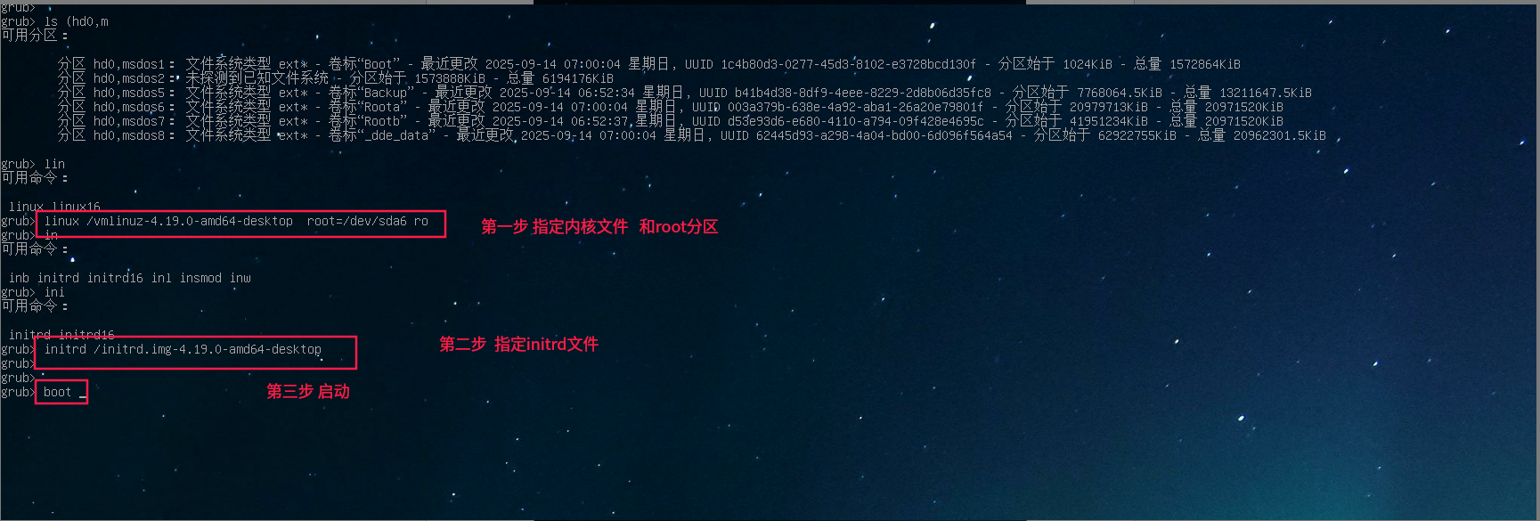 使用场景:当系统启动进入grub命令行界面,可尝试手动引导启动。