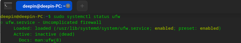 管理员身份执行systemctl status ufw查看ufw运行状态。