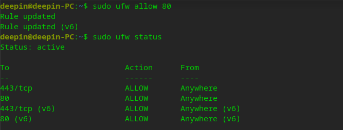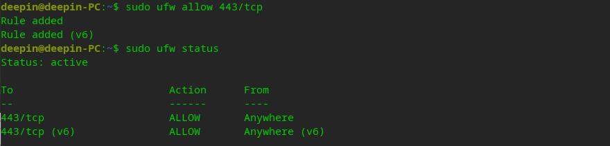 ufw allow 443/tcp #允许通过tcp协议访问443端口