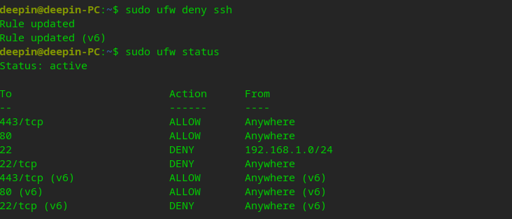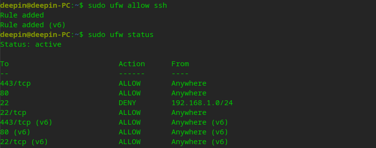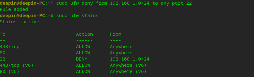 ufw deny from 192.168.1.0/24 to any port 22 #拒绝192.168.1.0网段设备访问22端口