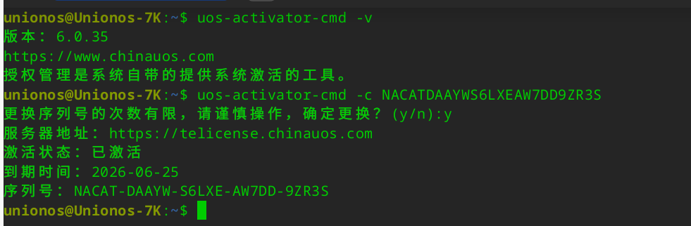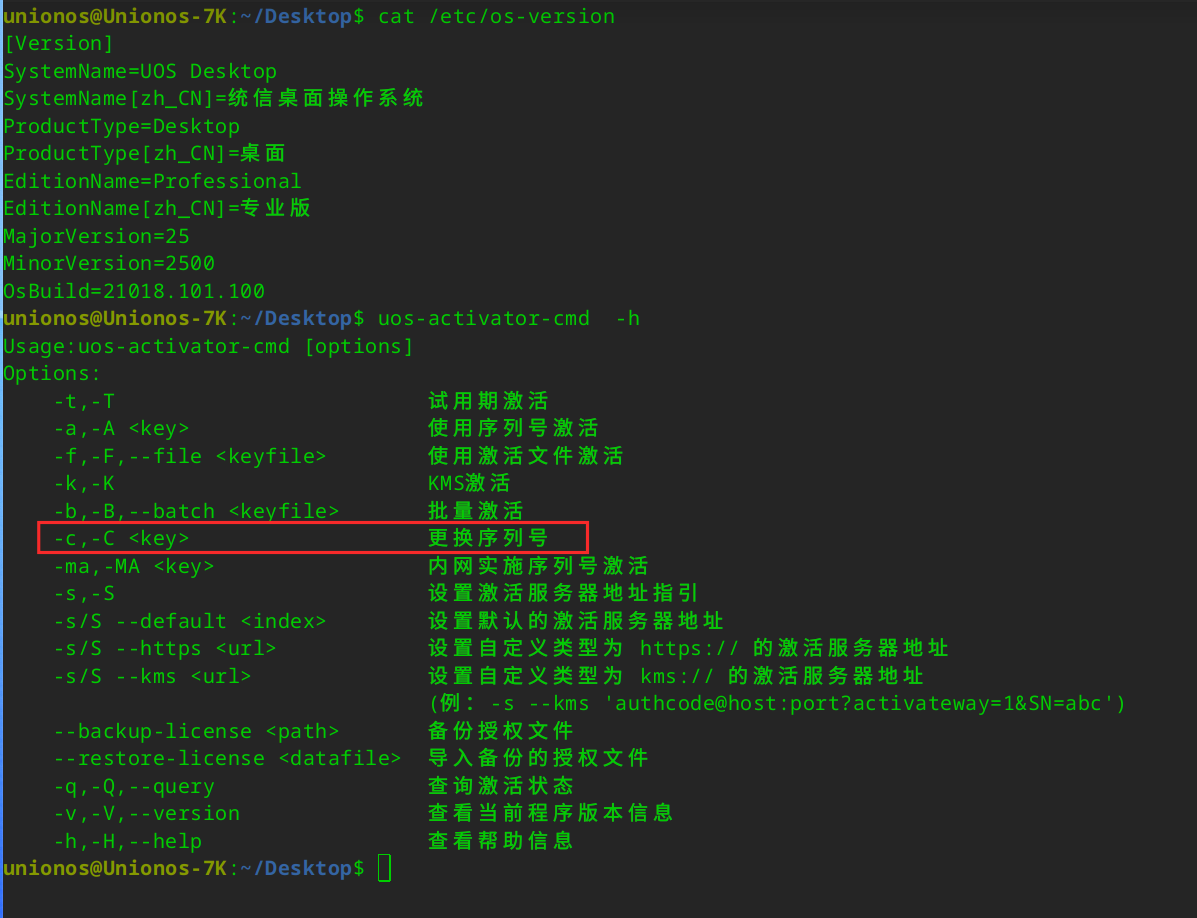 在2500版本中,授权客户端工具uos-activator-cmd支持更换激活码的功能(-c 参数能够更换激活码)如果系统之前是用试用期序列号激活,可以通过该功能进行激活码的更换,无需后台解绑。