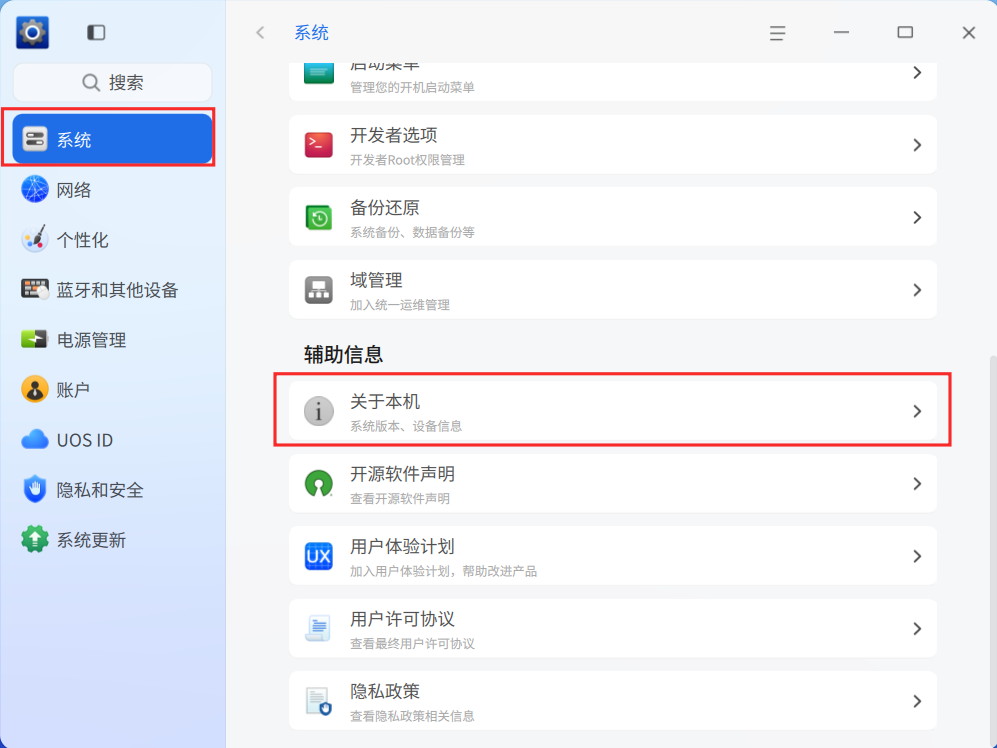 步骤一:从控制中心打开授权管理客户端:【控制中心】—【系统信息】—【关于本机】。