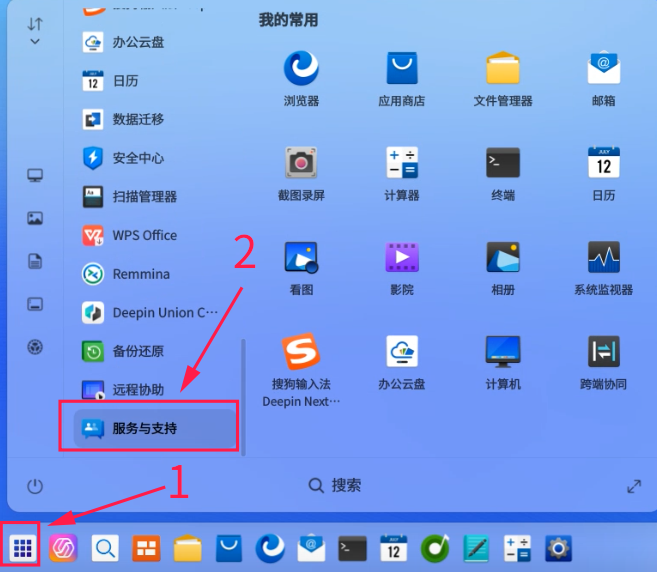 步骤一:在统信系统中,点击左下角【启动器】—【服务与支持】