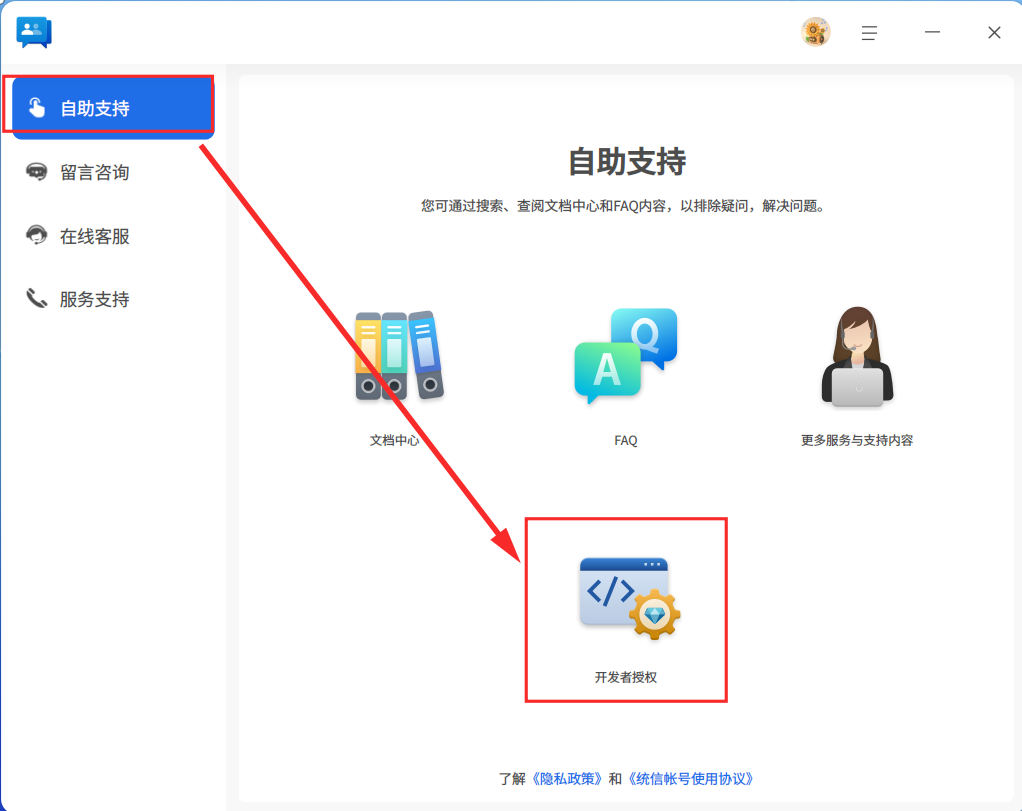 步骤二:在【自助支持】菜单中,点击“开发者授权”