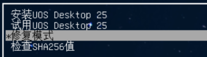 制作系统安装U盘,使用U盘启动,在启动引导界面使用上、下方向键选择“修复模式”,回车后进入。