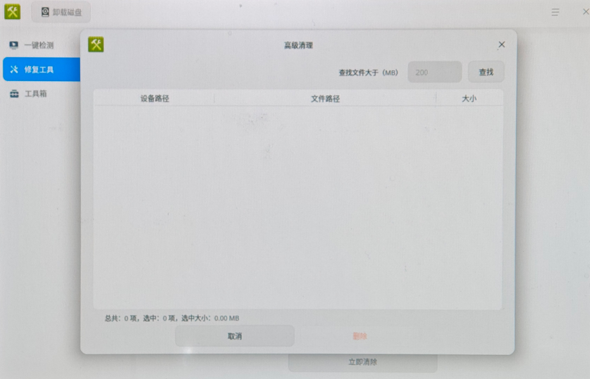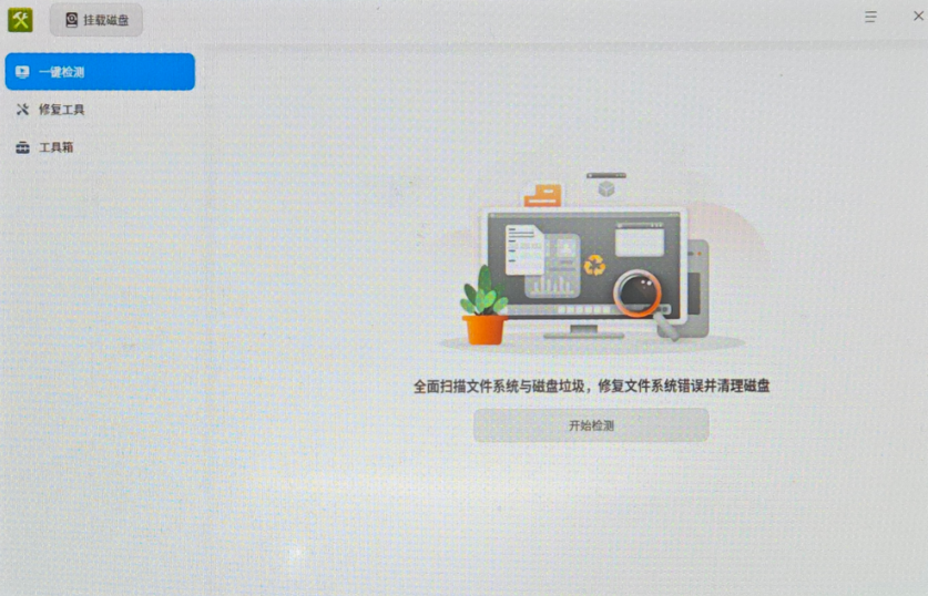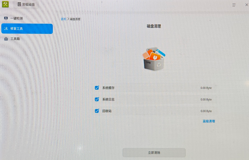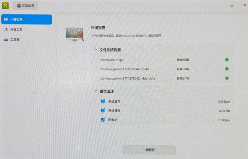 | 一键检测 | — | — | 全面扫描文件系统与磁盘垃圾,修复文件系统错误并清理磁盘中的指定无用文件 |