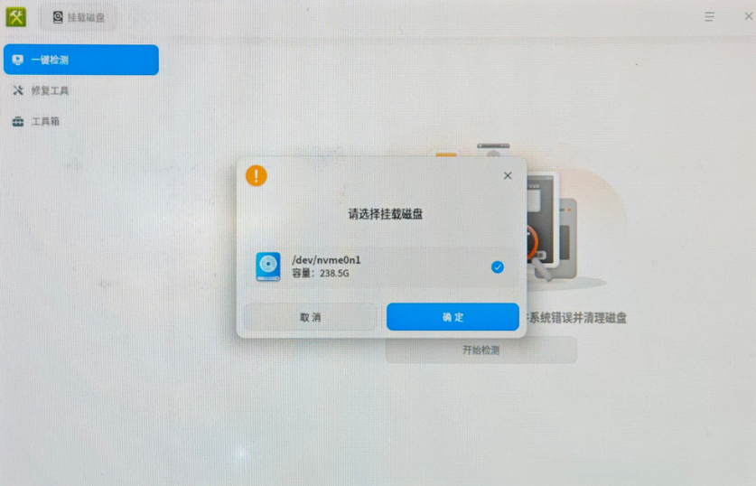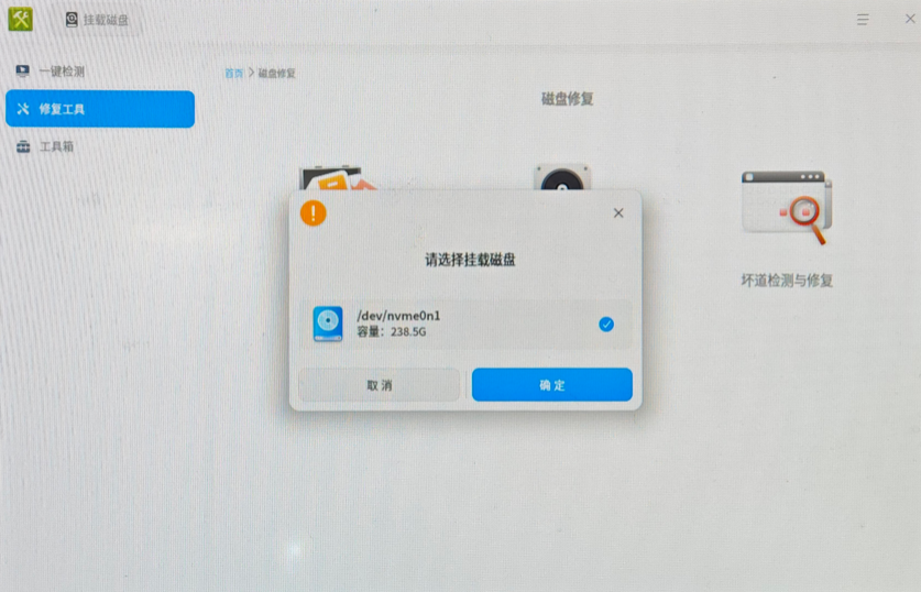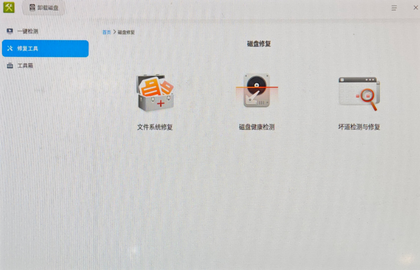在“修复工具”-“磁盘修复”中,点击打开“磁盘健康检测”,按提示选择需要检测的磁盘。