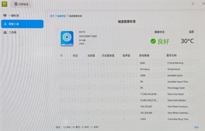 下图为磁盘健康状况示例,可以按需“导出”此检测信息。
