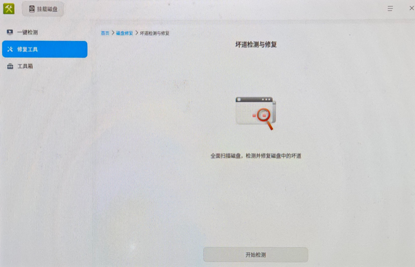 在“修复工具”-“磁盘修复”中,点击打开“坏道检测与修复”,点击“开始检测”。