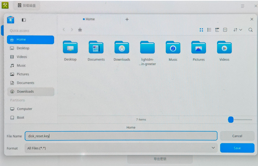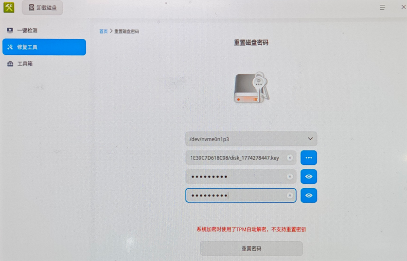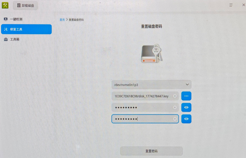 选择对应的磁盘分区,并选择在安装系统阶段勾选“加密安装”时生成的密钥文件,下方输入两次新密码,之后点击“重置密码”。