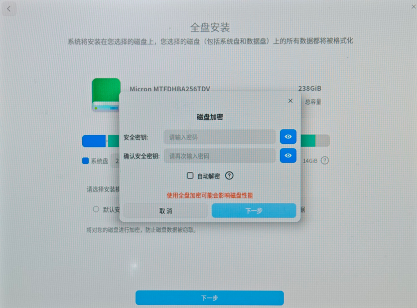 【注2】补充一下在最初安装系统阶段的加密设置界面,如下图所示。是否可以重置磁盘密码,与此阶段是否勾选了“自动解密”有关