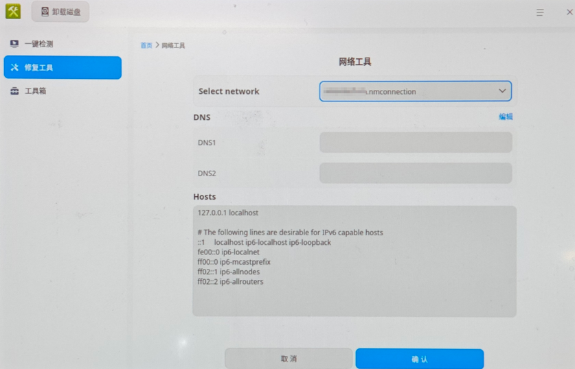 在“修复工具”中,点击打开“网络工具”,选择挂载磁盘。
