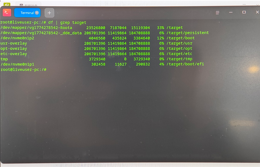 在“工具箱”中,点击打开“终端”,进入LiveCD模式的命令行窗口。