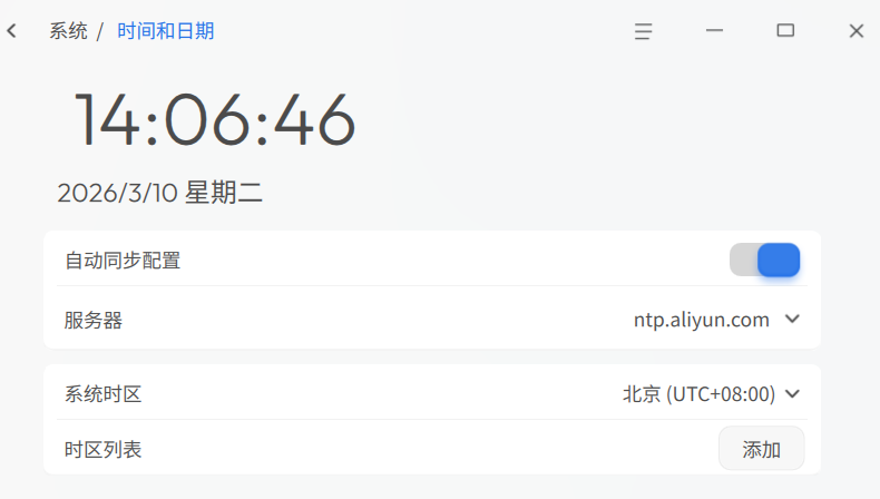 默认情况下,系统通过网络自动同步该时区的本地时间和日期。您也可以关闭自动同步配置,手动修改时间和日期。