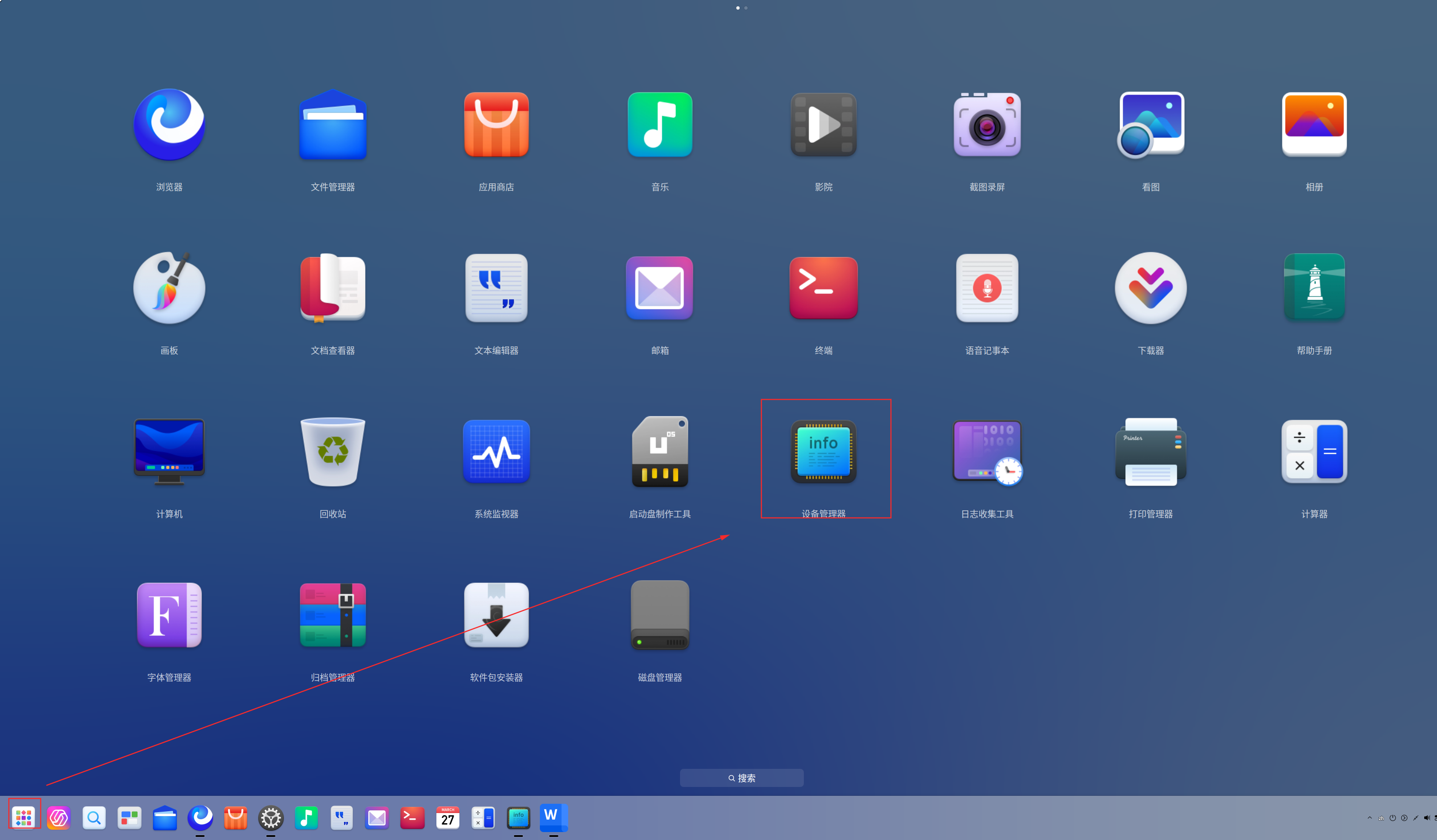 任务栏点击【启动器】-【设备管理器】,可打开设备管理器,如下图