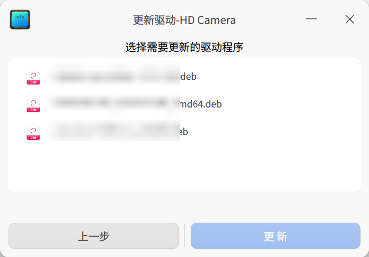 3. 系统会检测该文件位置包含的所有可安装的deb和ko格式驱动文件,选择对应的驱动文件后,单击 更新 按钮。