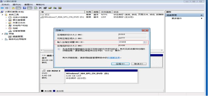 具备方法:右键我的电脑——管理——磁盘管理,选择单独一个非系统盘磁盘删除盘(这里注意选择提前将重要文件移出备份)或者压缩一部分空间出来。