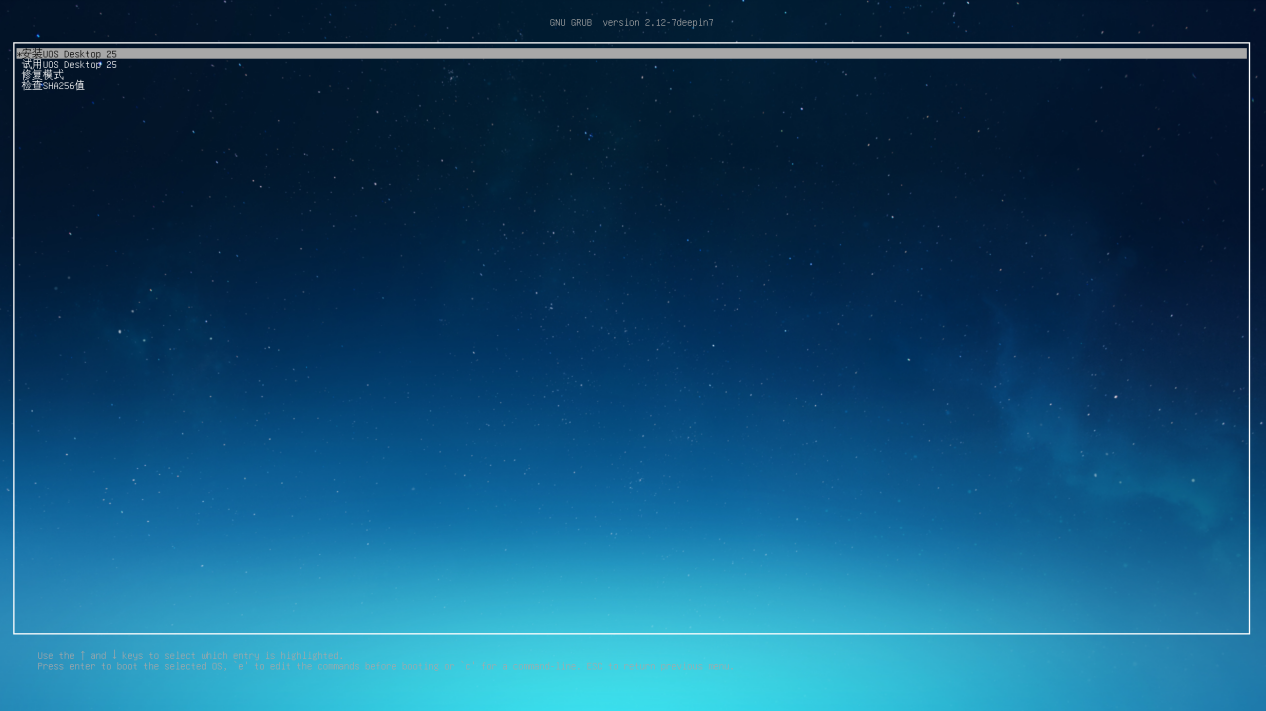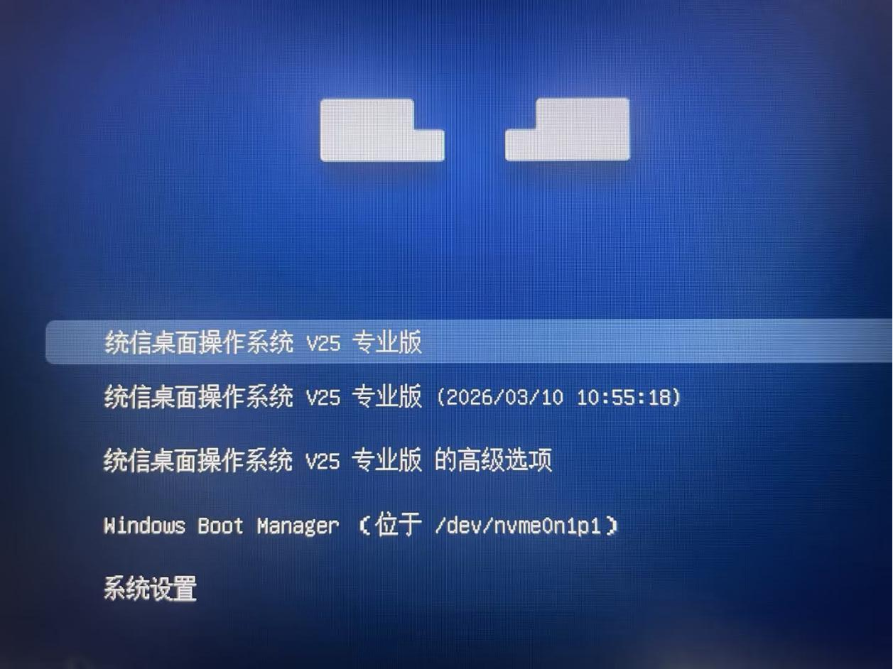 UOS系统安装完成后,可以在grub界面看到UOS与Windows的启动选项,可以根据自己的需求按键盘中的上或下方向键选择系统进入;