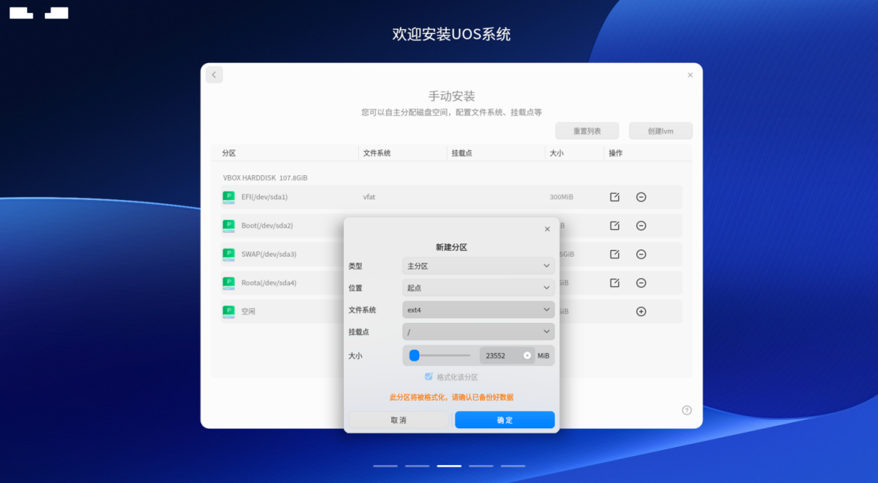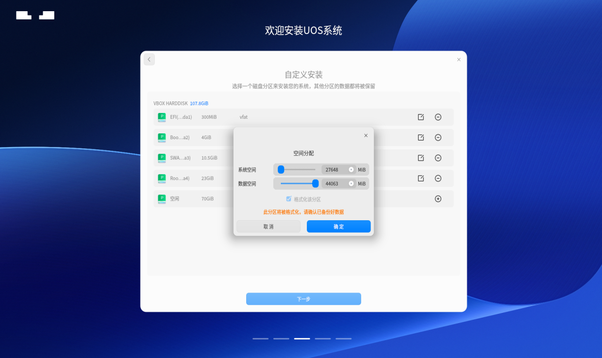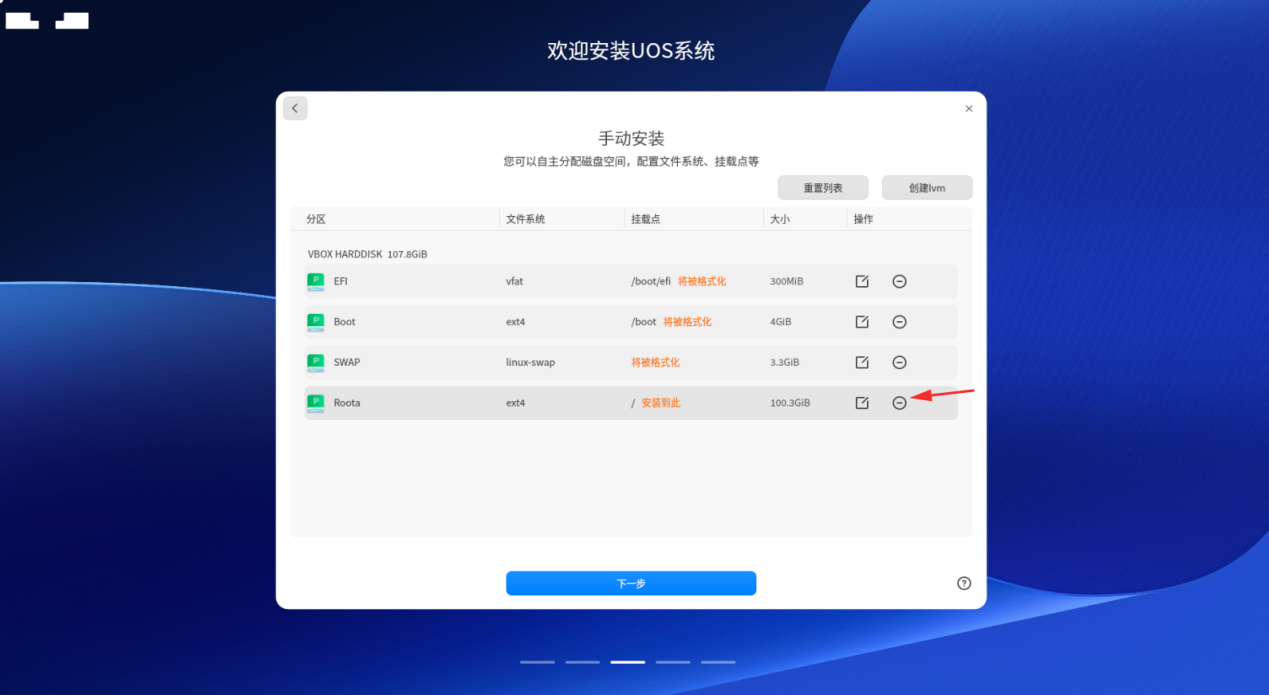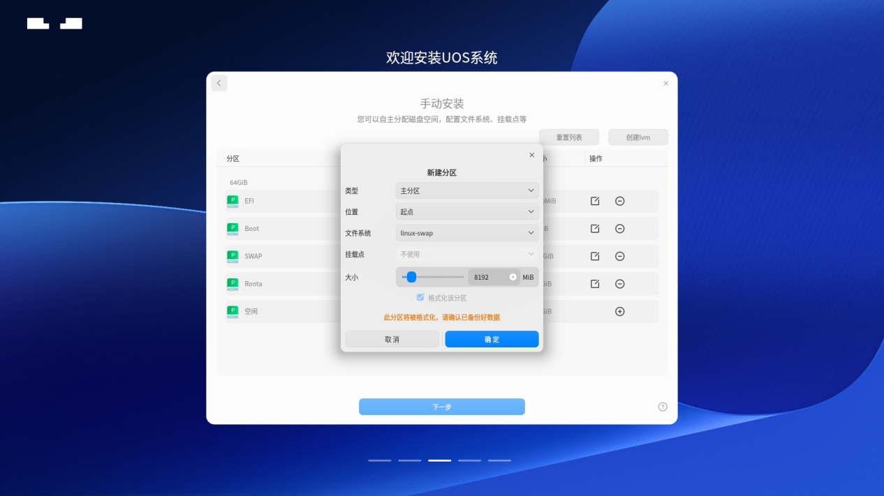 待所有的分区创建完成后,点击下一步开始系统安装,并按照提示完成UOS系统安装即可。