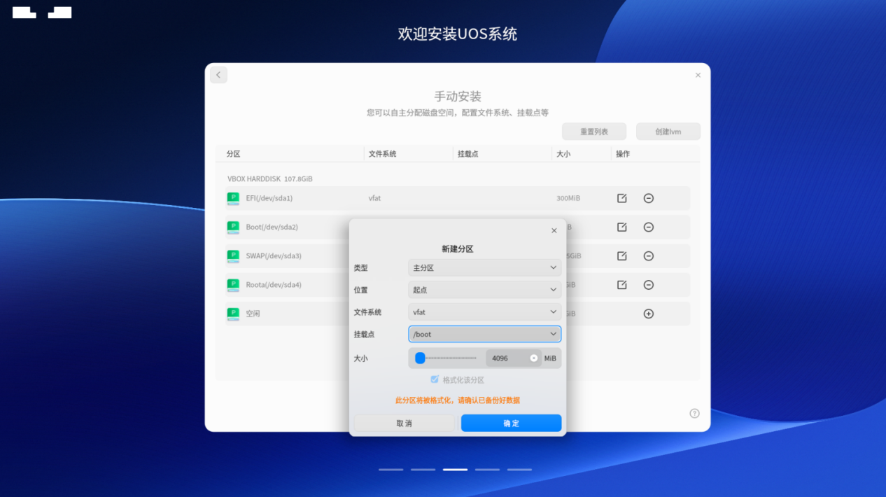 按上表中设置/boot分区,类型:主分区、位置:起点、文件系统:ext4、挂载点:/boot、大小:4096MB
