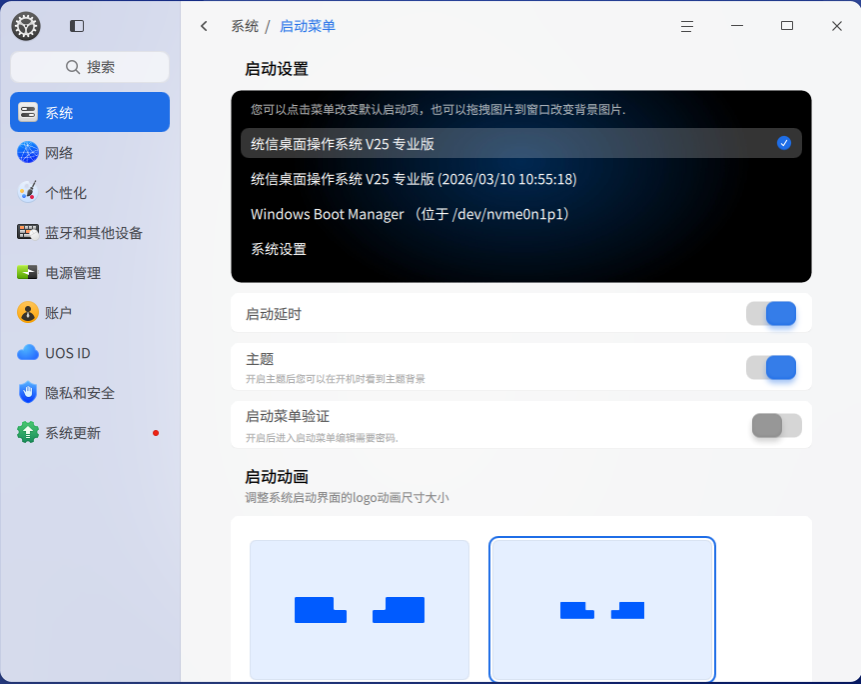 若每次开机默认想从UOS或者Windows进行启动,则可再UOS系统的 控制中心——通用——启动菜单 中去设置启动项