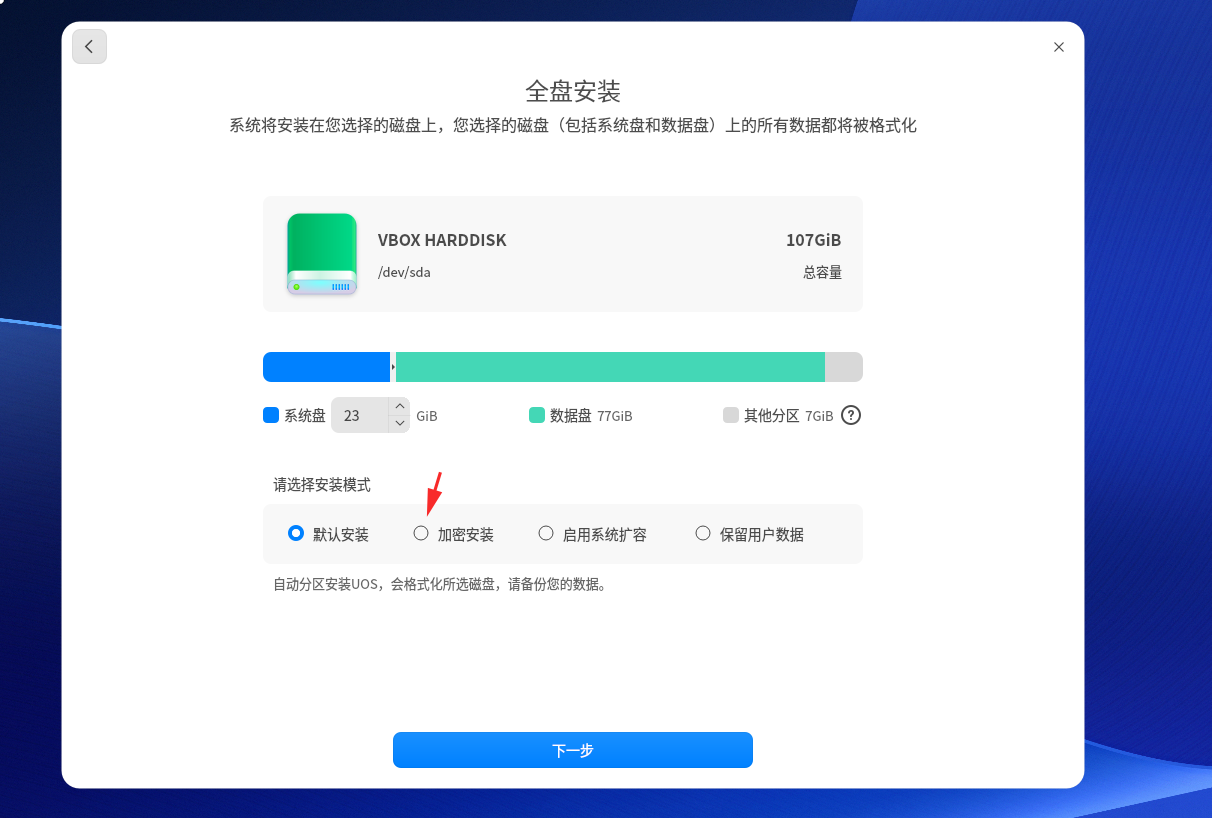 该步骤中功能补充说明:1、全盘加密功能,2、保留用户数据 (默认未勾选功能)