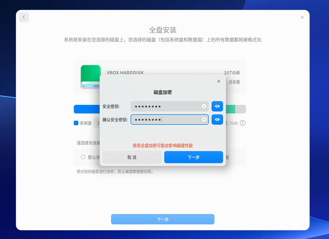 全盘加密的作用是保护磁盘数据,提高数据安全性。可自行选择是否要设置,若您需要设置,则在全盘安装界面中勾选全盘加密后,单击下一步按钮,将进入到全盘加密界面,在输入加密密码后,可以正常的安装系统,如下图: