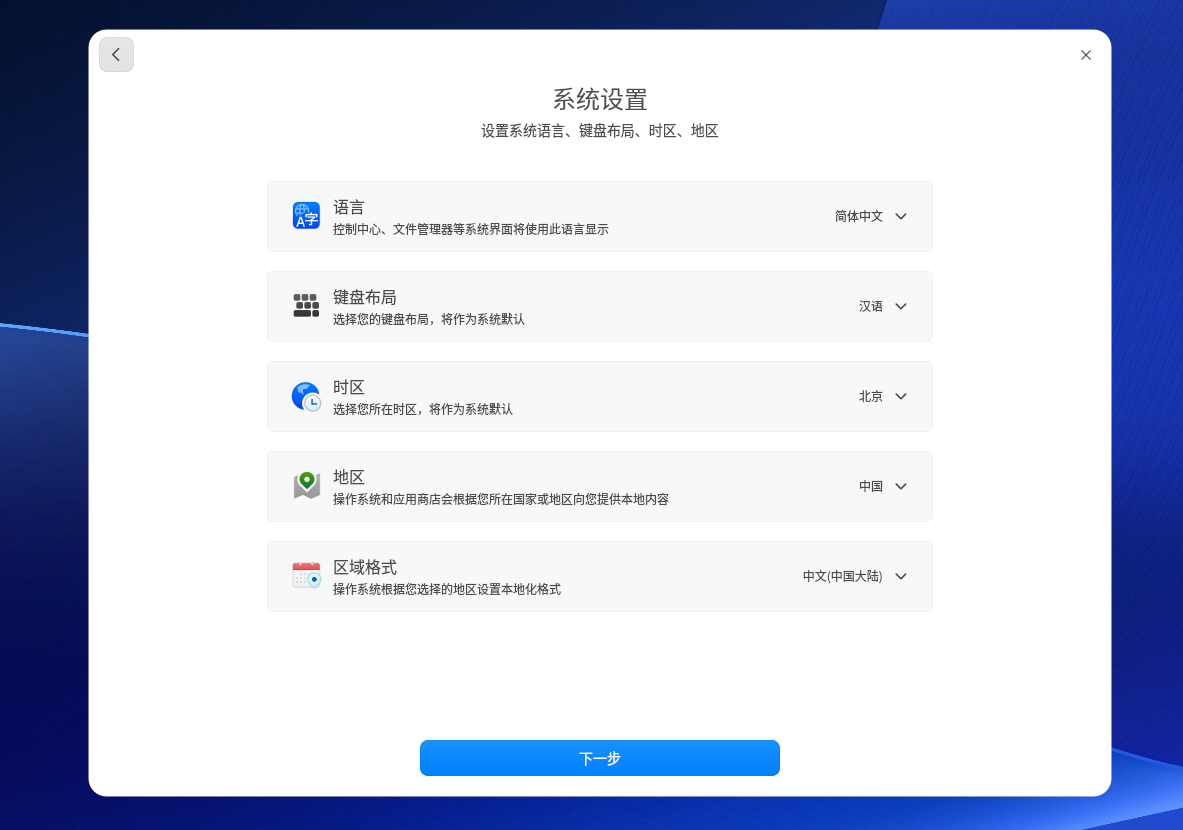 步骤八:设置系统语言、时区等