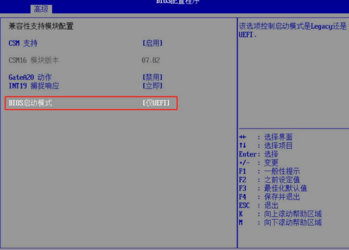2、BISO设置将主机 BIOS 下 CSM 配置的 BIOS 启动模式选项设置为仅 UEFI