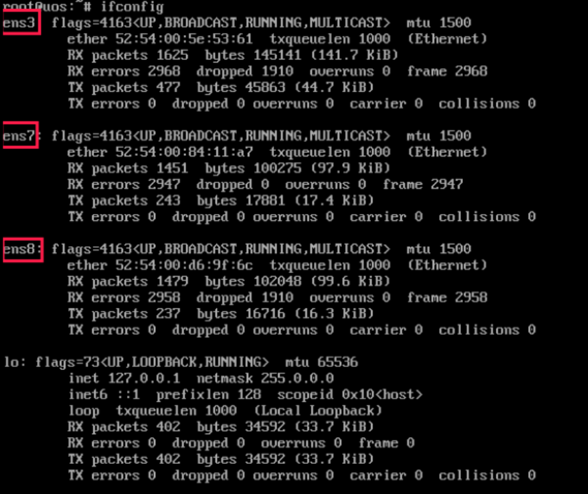 准备一台服务器,至少包含两个物理网口。如下图所示的服务器有ens3、ens7、ens8三个物理网口。