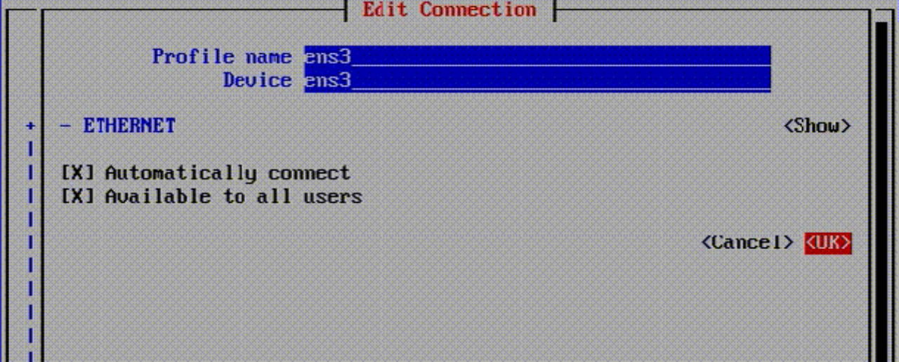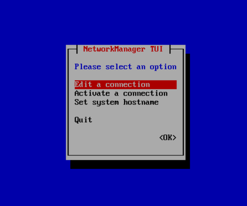 执行命令nmtui,进入配置界面,选择Edit a connection,后选择OK