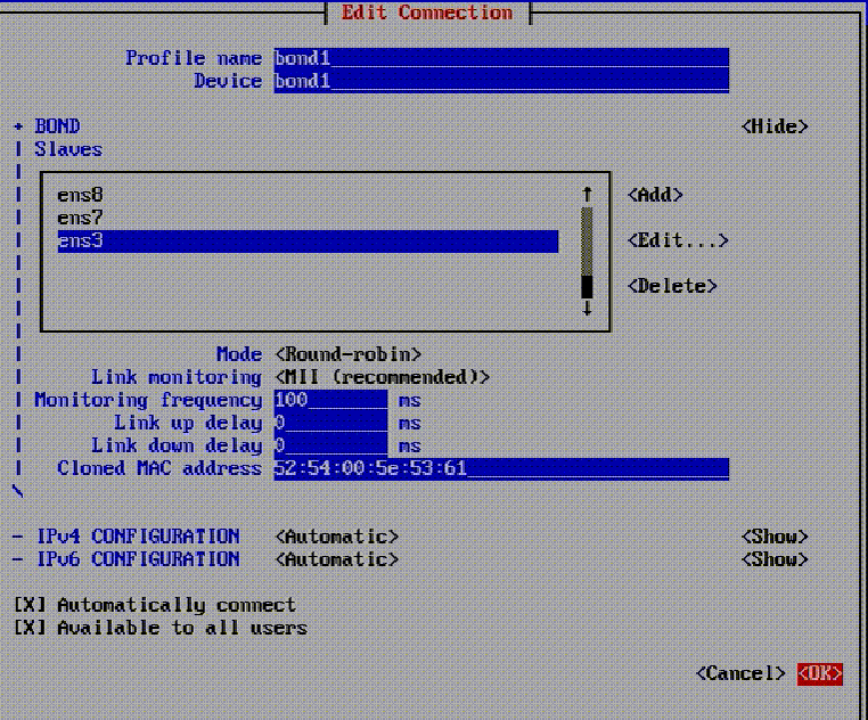 重复上一步操作,将ens7、ens8加入到bond1后,填入任一网卡mac地址,确认信息无误后选中OK。