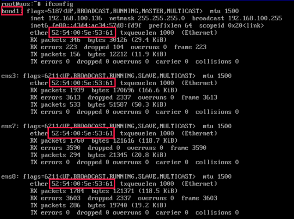 执行命令ifconfig,此时网络信息如图,可以看到bond1以及ens3,ens7,ens8的mac地址都被固定为设定的mac地址了。