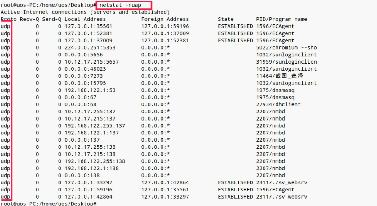 输入:netstat -nuap 查看 UDP 协议