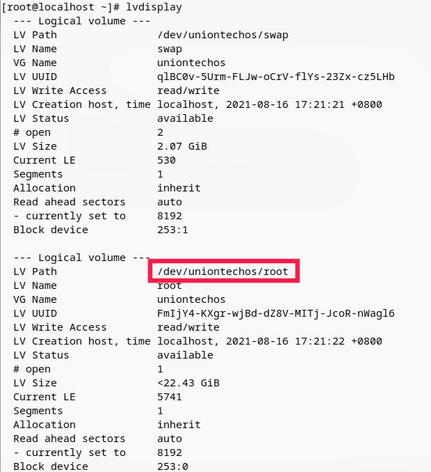 输入lvdisplay 查看当前需要扩容的卷组位置