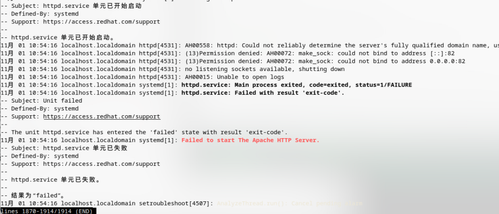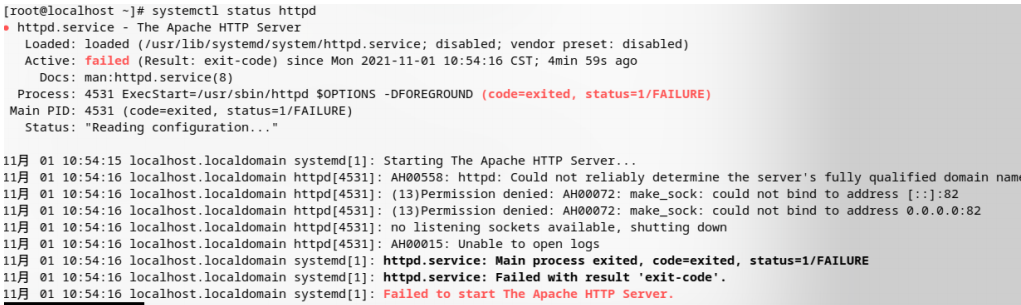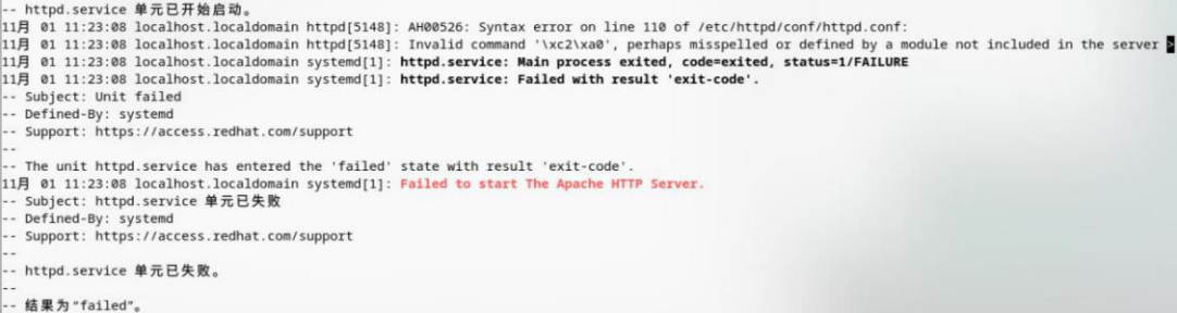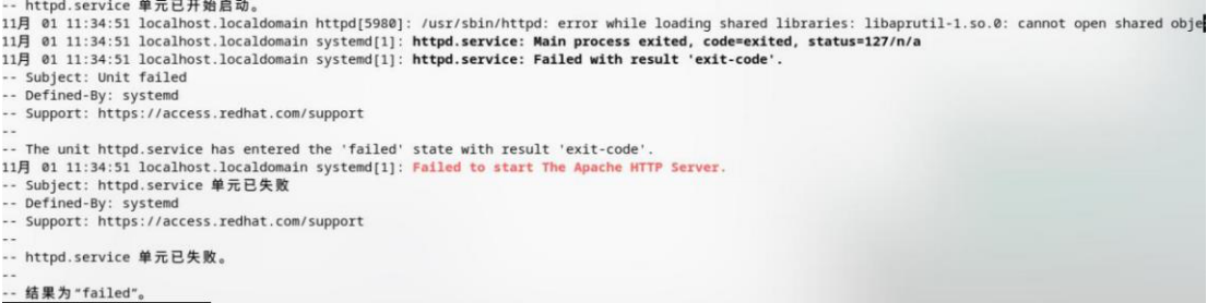服务启动失败,当服务启动时候出现 journalctl -xe 时可以在终端输入 journalctl -xe,查看服务报错信息,或者使用 systemctl status httpd 查看服务报错信息。