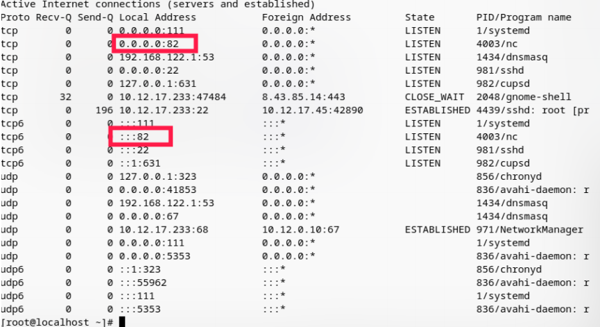 从上图可以看到nc进程占用82端口,关闭nc进程并重启httpd服务即可解决端口被占用的问题